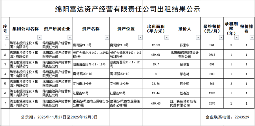綿陽富達(dá)資產(chǎn)經(jīng)營(yíng)有限責(zé)任公司出租結(jié)果公示