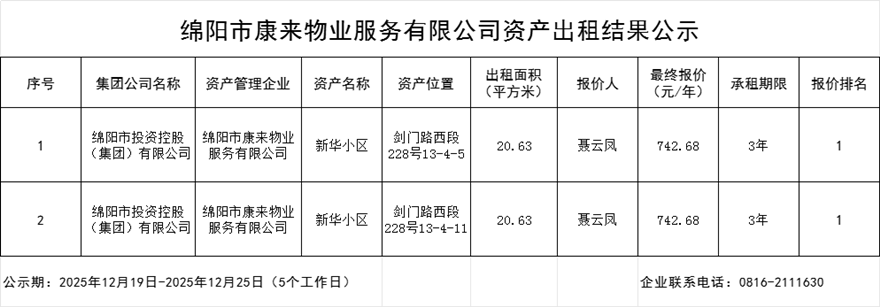 綿陽市康來物業(yè)服務有限公司資產(chǎn)出租結果公示