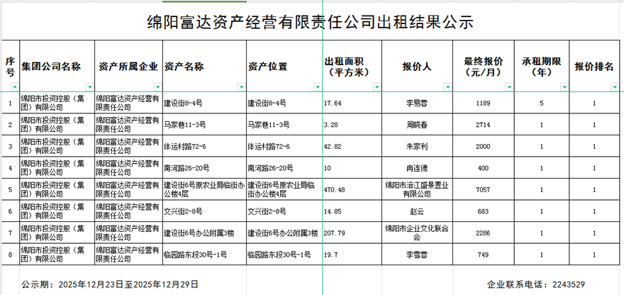 綿陽(yáng)富達(dá)資產(chǎn)經(jīng)營(yíng)有限責(zé)任公司出租結(jié)果公示