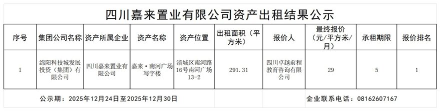 四川嘉來置業(yè)有限公司資產(chǎn)出租結(jié)果公示
