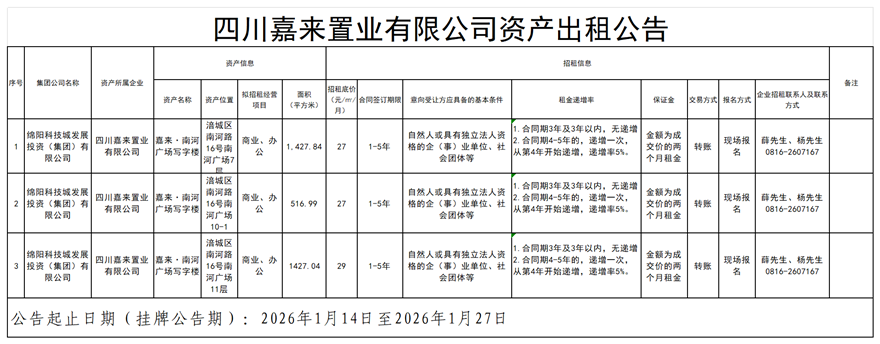 四川嘉來置業(yè)有限公司資產(chǎn)出租公告