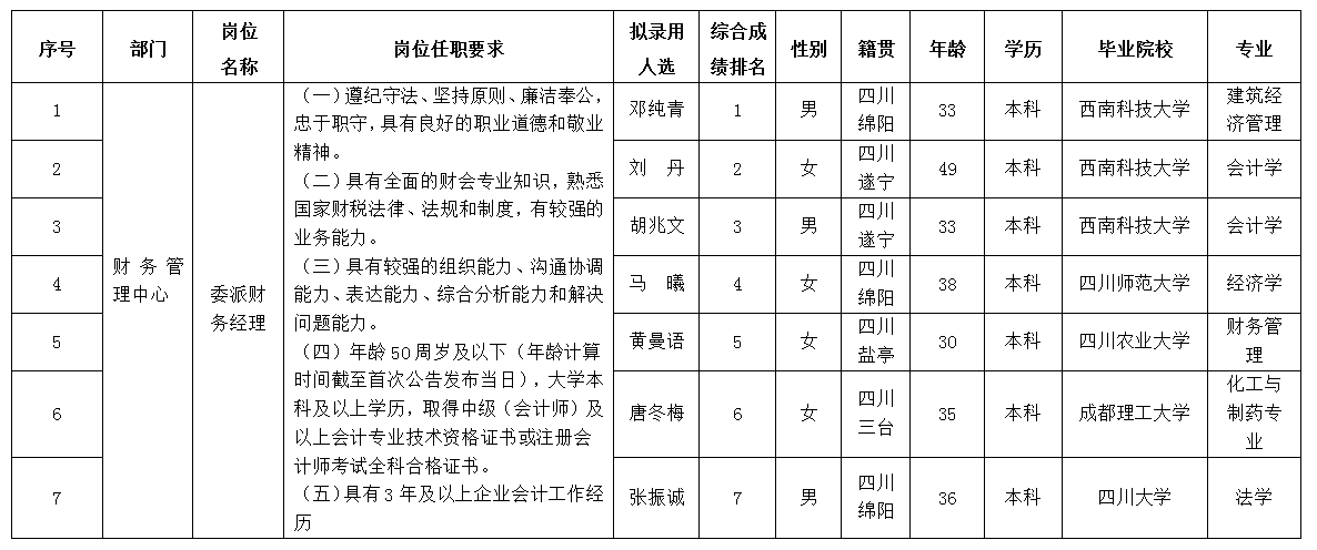 根據(jù)綿陽市投資控股(集團(tuán))有限公司發(fā)布的招聘公告及招聘相關(guān)規(guī)定,經(jīng)筆試、面試、考察等程序,擬錄用鄧純青等同志作為集團(tuán)委派財(cái)務(wù)經(jīng)理崗位擬錄用人員,現(xiàn)予以公示,具體情況如下: