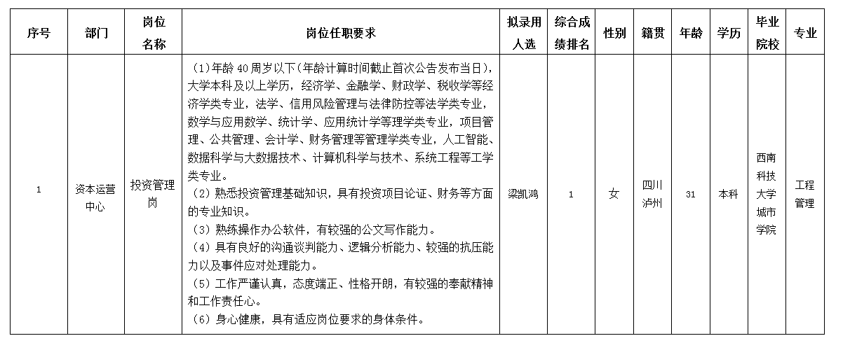 根據(jù)綿陽(yáng)市投資控股(集團(tuán))有限公司發(fā)布的招聘公告及招聘相關(guān)規(guī)定,經(jīng)筆試、面試、背調(diào)等程序,擬錄用梁凱鴻同志到綿陽(yáng)市投資控股(集團(tuán))有限公司工作,現(xiàn)予以公示,具體情況如下:
