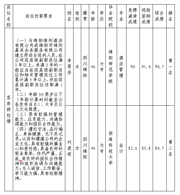 根據(jù)綿陽市綿州嘉來會務服務有限公司發(fā)布的招聘公告及招聘相關規(guī)定,經競聘演講、現(xiàn)場答辯等程序,現(xiàn)將競聘成績予以公示。