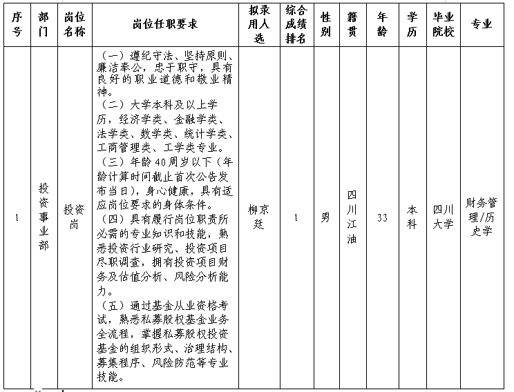 根據(jù)綿陽綿投私募基金管理有限公司發(fā)布的招聘公告及招聘相關(guān)規(guī)定,經(jīng)筆試、面試、背調(diào)等程序,擬錄用柳京廷同志到綿陽綿投私募基金管理有限公司工作,現(xiàn)予以公示,具體情況如下: