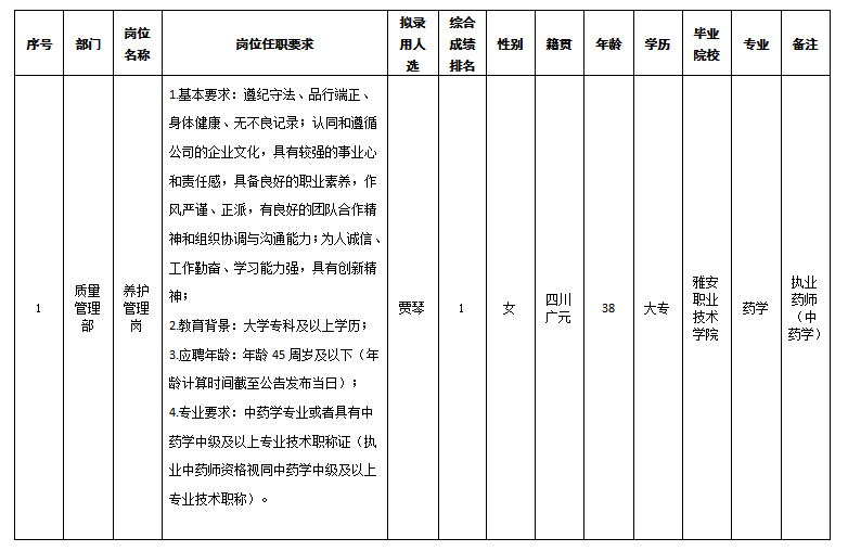根據(jù)四川嘉來(lái)海川醫(yī)療科技有限公司發(fā)布的招聘公告及招聘相關(guān)規(guī)定,經(jīng)筆試、面試、背調(diào)、體檢等程序,擬錄用賈琴同志到四川嘉來(lái)海川醫(yī)療科技有限公司工作,現(xiàn)予以公示,具體情況如下: