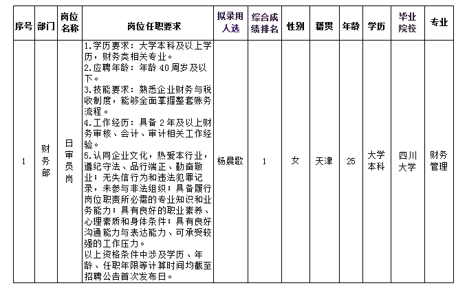 根據(jù)綿陽富樂山九洲國際酒店有限公司發(fā)布的招聘公告及招聘相關規(guī)定,經筆試、面試、背調、體檢等程序,擬錄用楊晨歌同志到綿陽富樂山九洲國際酒店有限公司工作,現(xiàn)予以公示,具體情況如下: