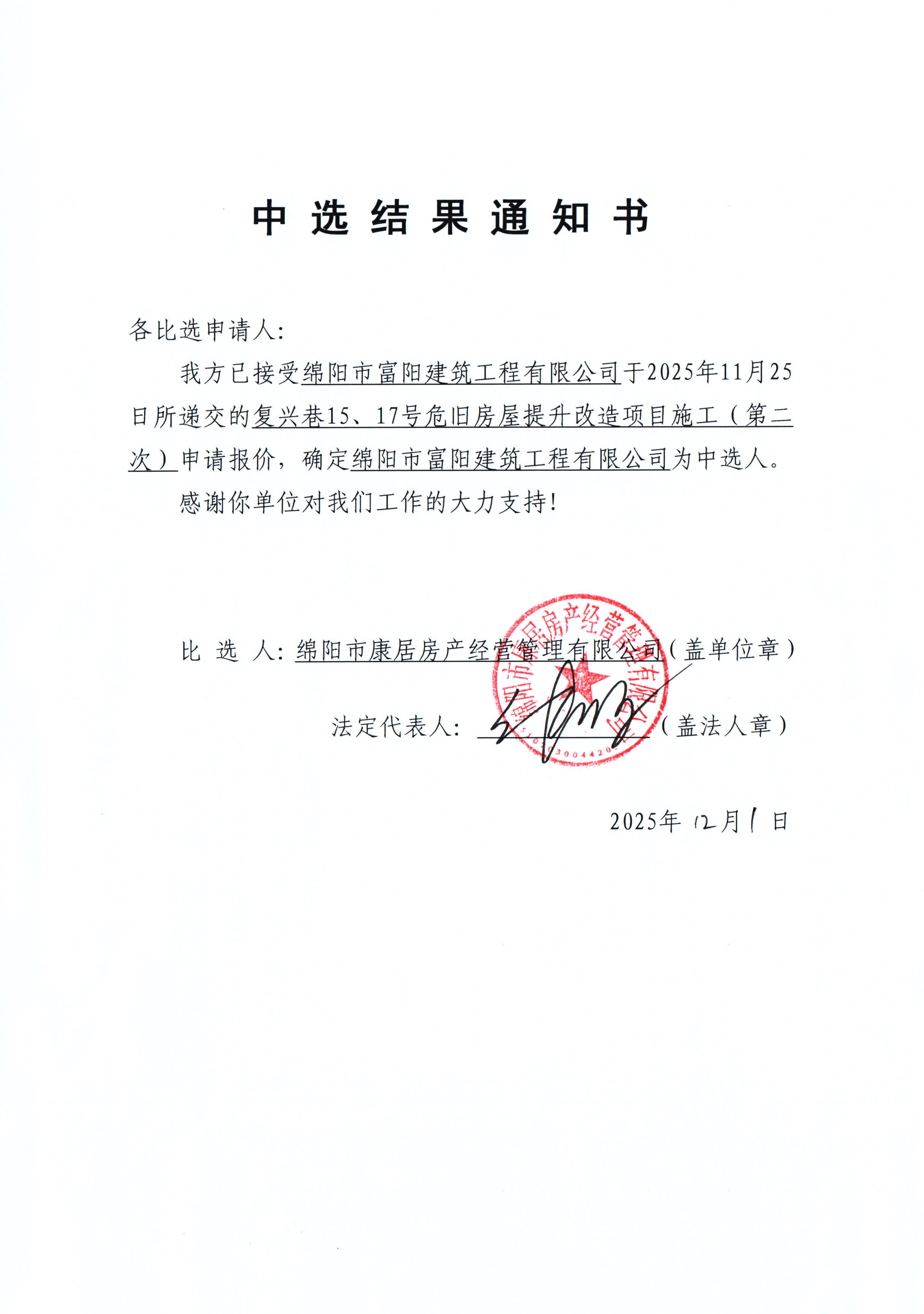 復(fù)興巷15、17號危舊房屋提升改造項目施工(第二次)中選結(jié)果通知