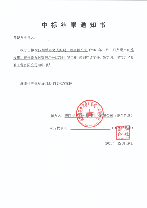 綿投集團(tuán)幫扶聯(lián)系村鎮(zhèn)路燈采購(gòu)項(xiàng)目(第二批)中標(biāo)結(jié)果通知