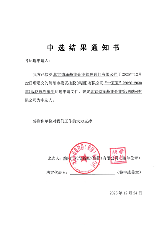 綿陽市投資控股(集團(tuán))有限公司“十五五”(2026-2030年)戰(zhàn)略規(guī)劃編制中選結(jié)果通知