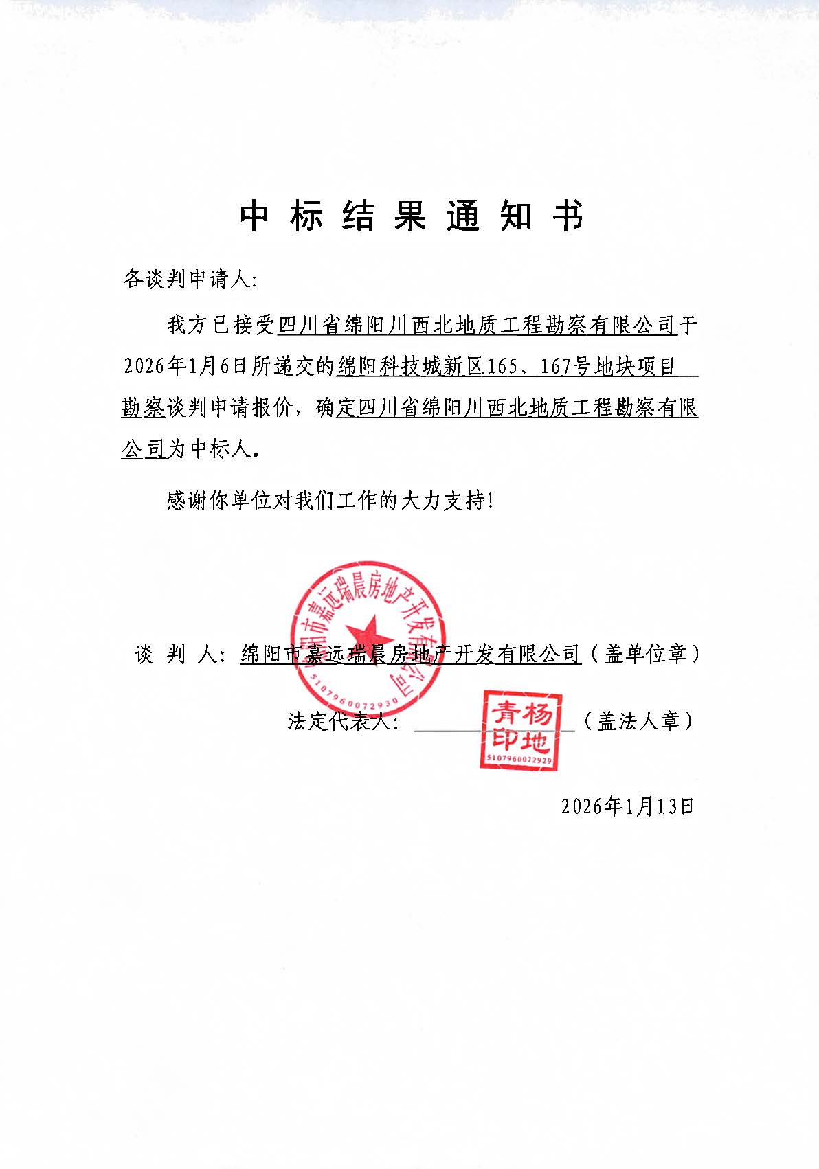 綿陽(yáng)科技城新區(qū)165、167號(hào)地塊項(xiàng)目勘察中標(biāo)結(jié)果通知
